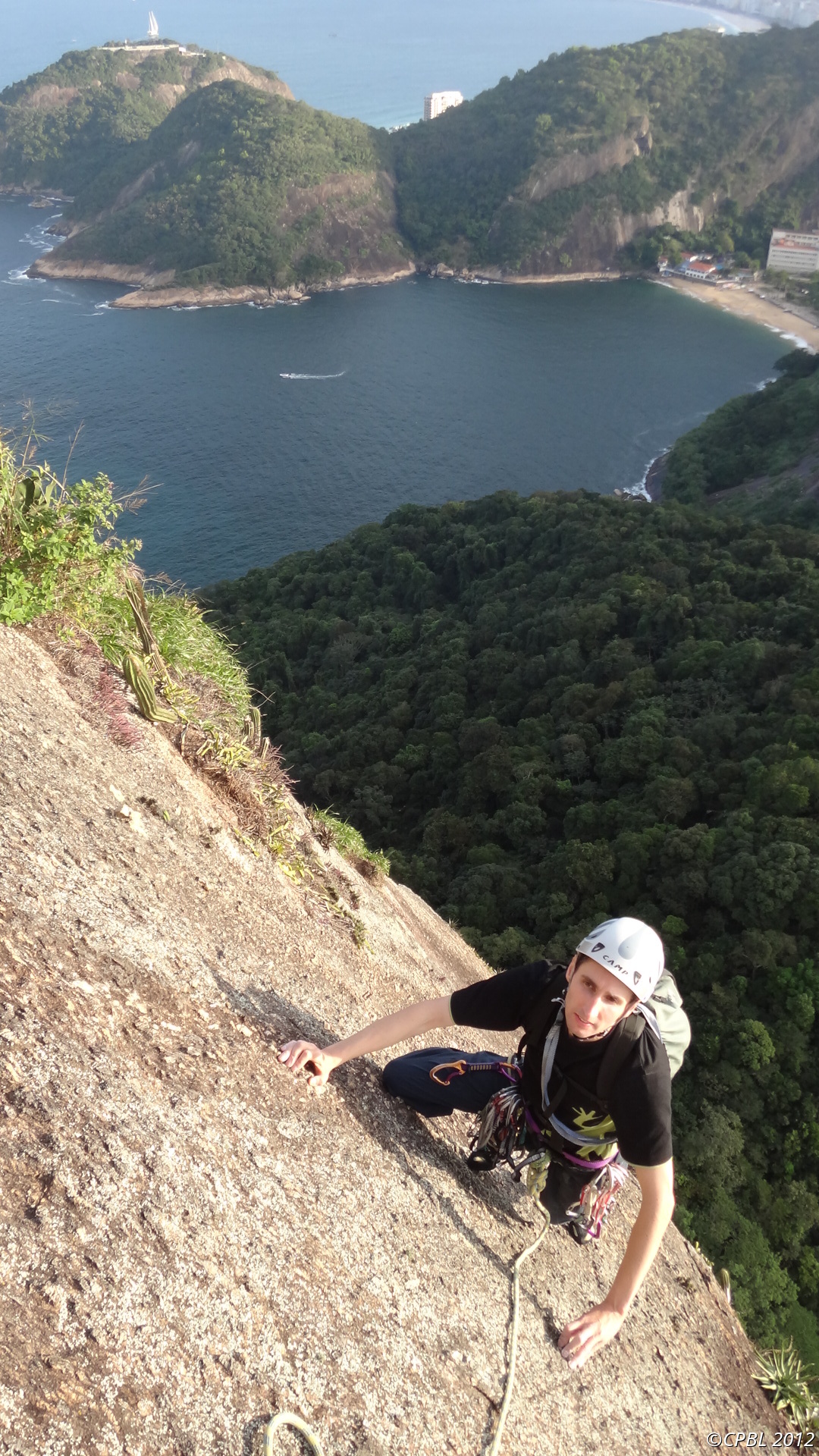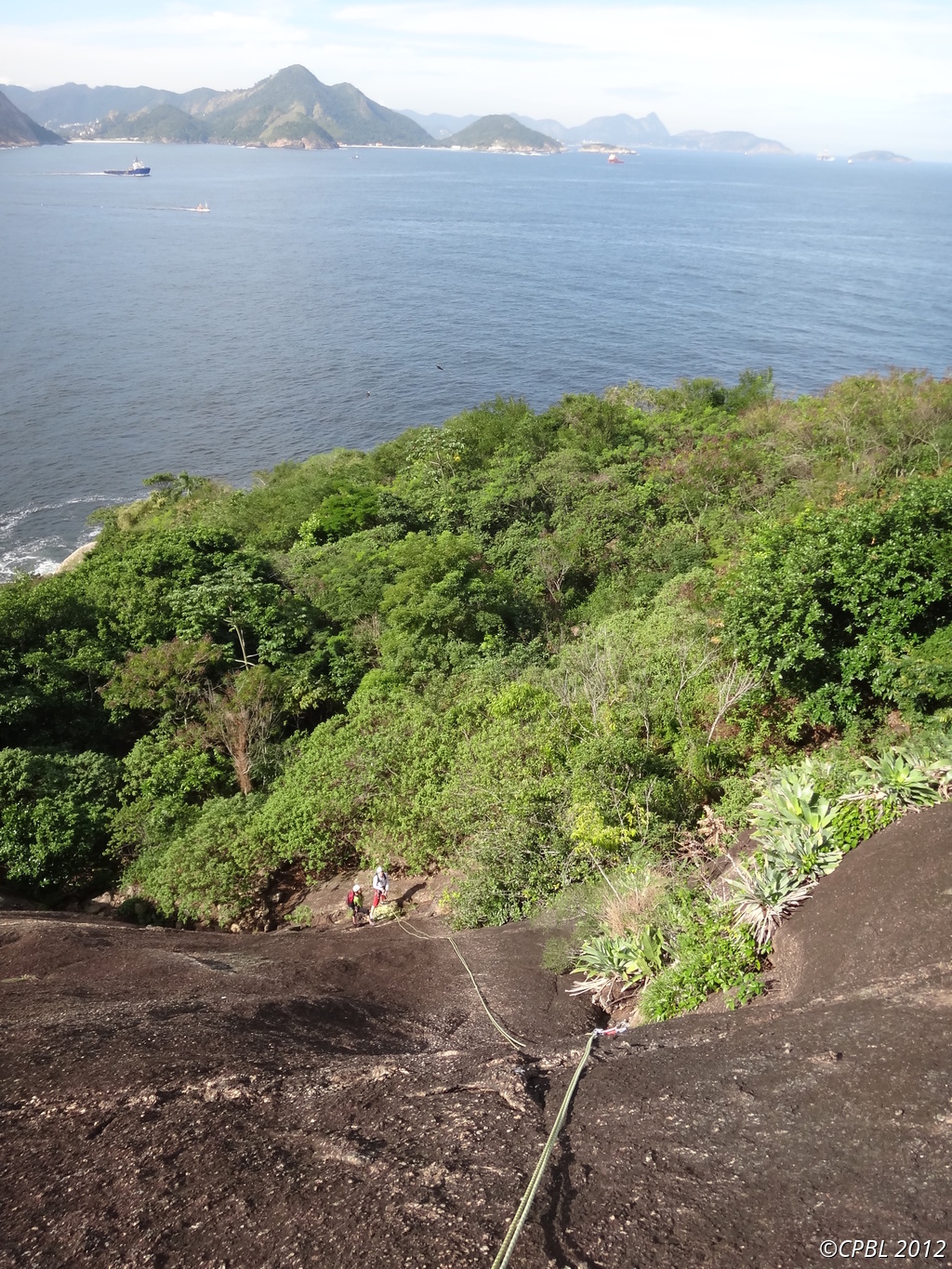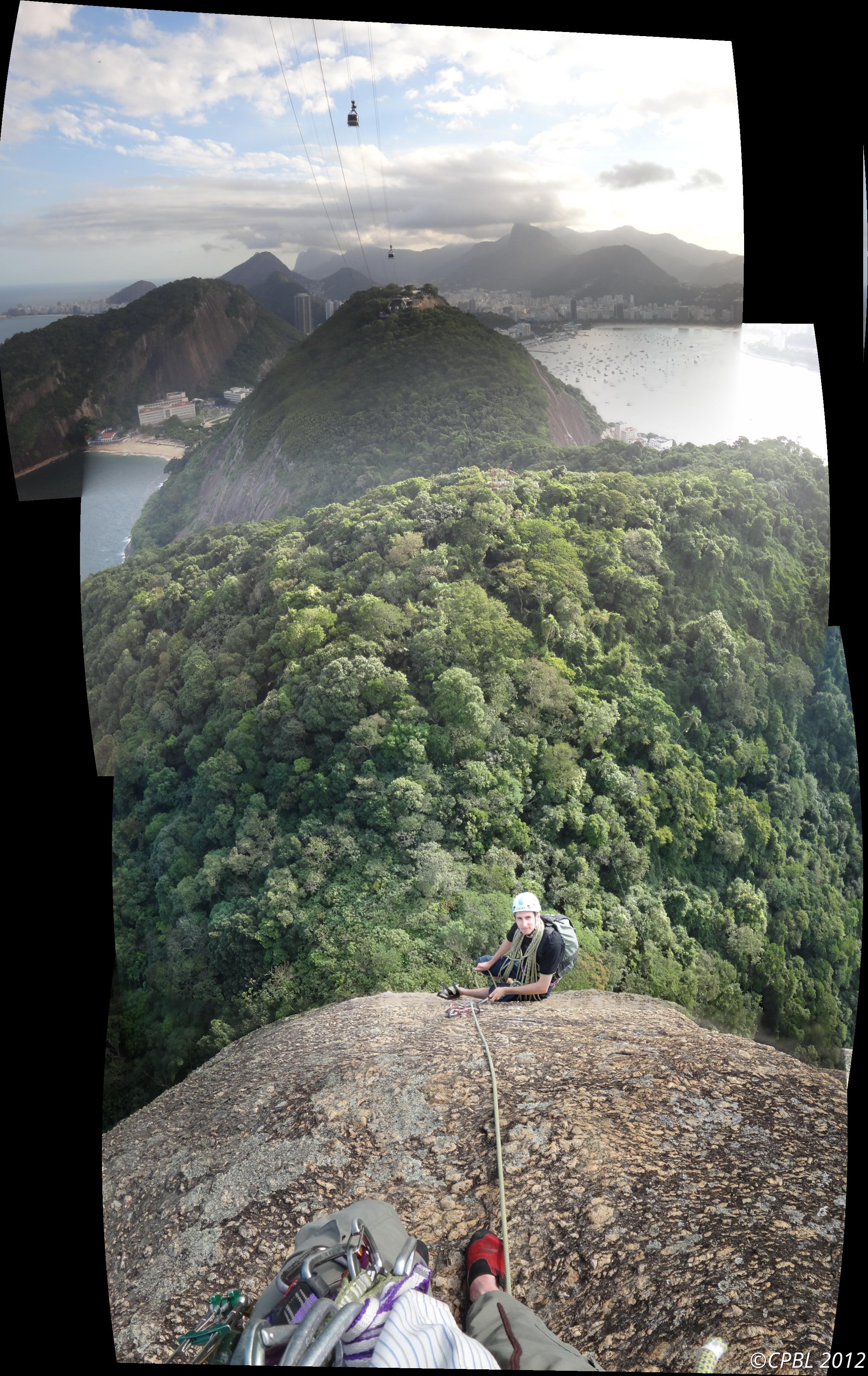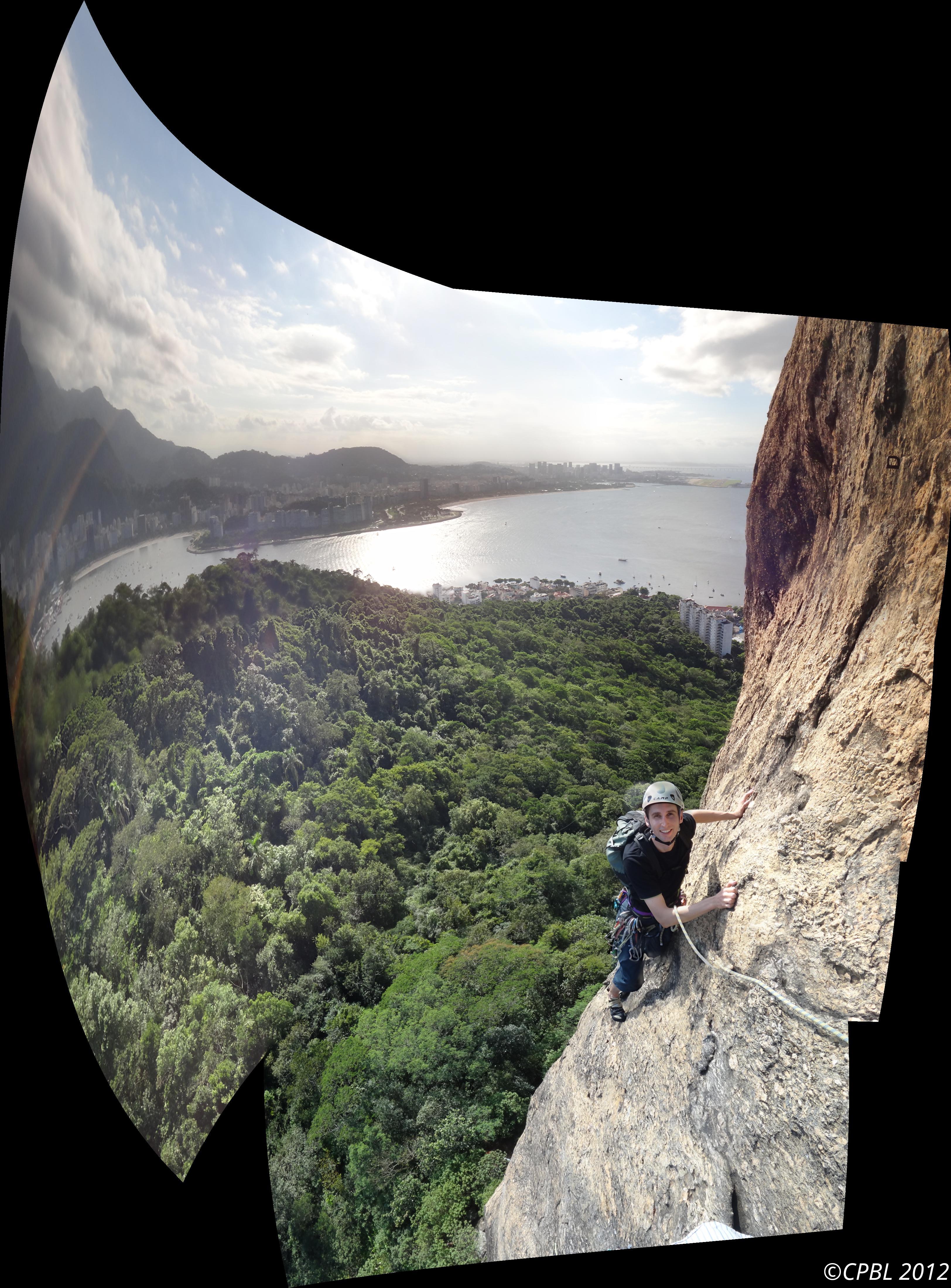 | | and I linked the final two. The last pitch is a face augmented with cement drips from the construction of the massive reinforcements above. In the background appears the Urca area (including the Sugarloaf), where we did the rest of our climbing. |