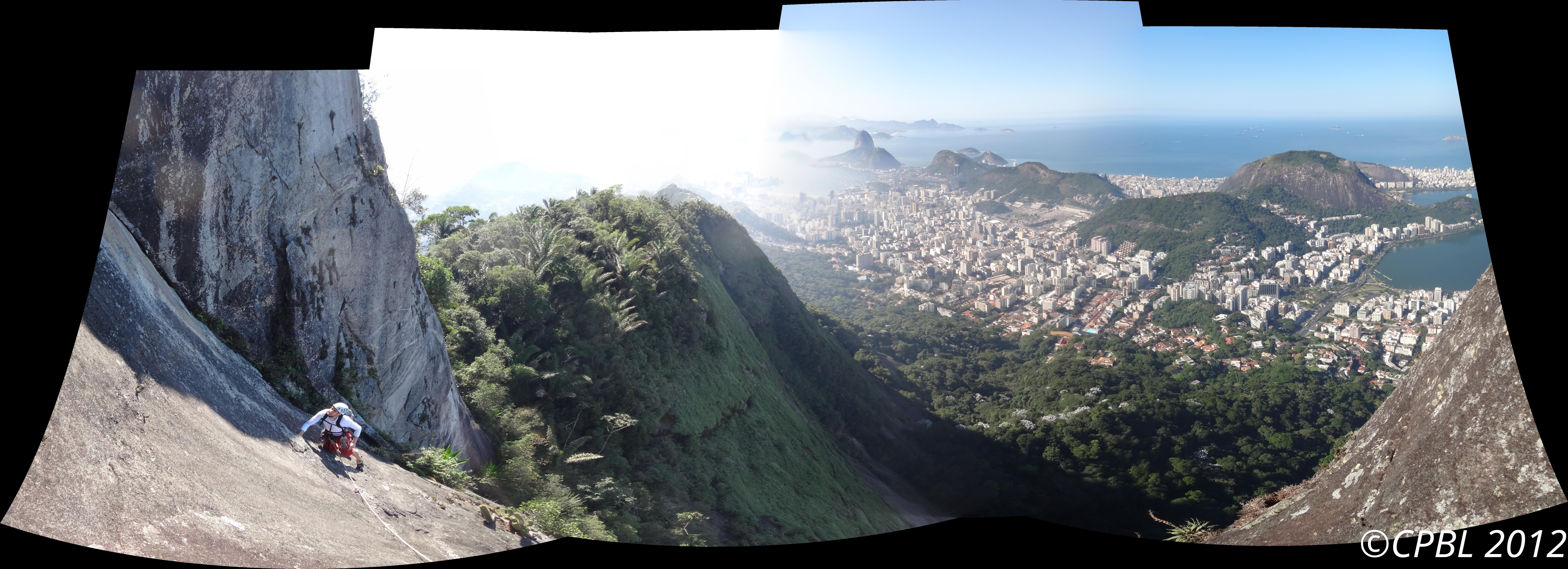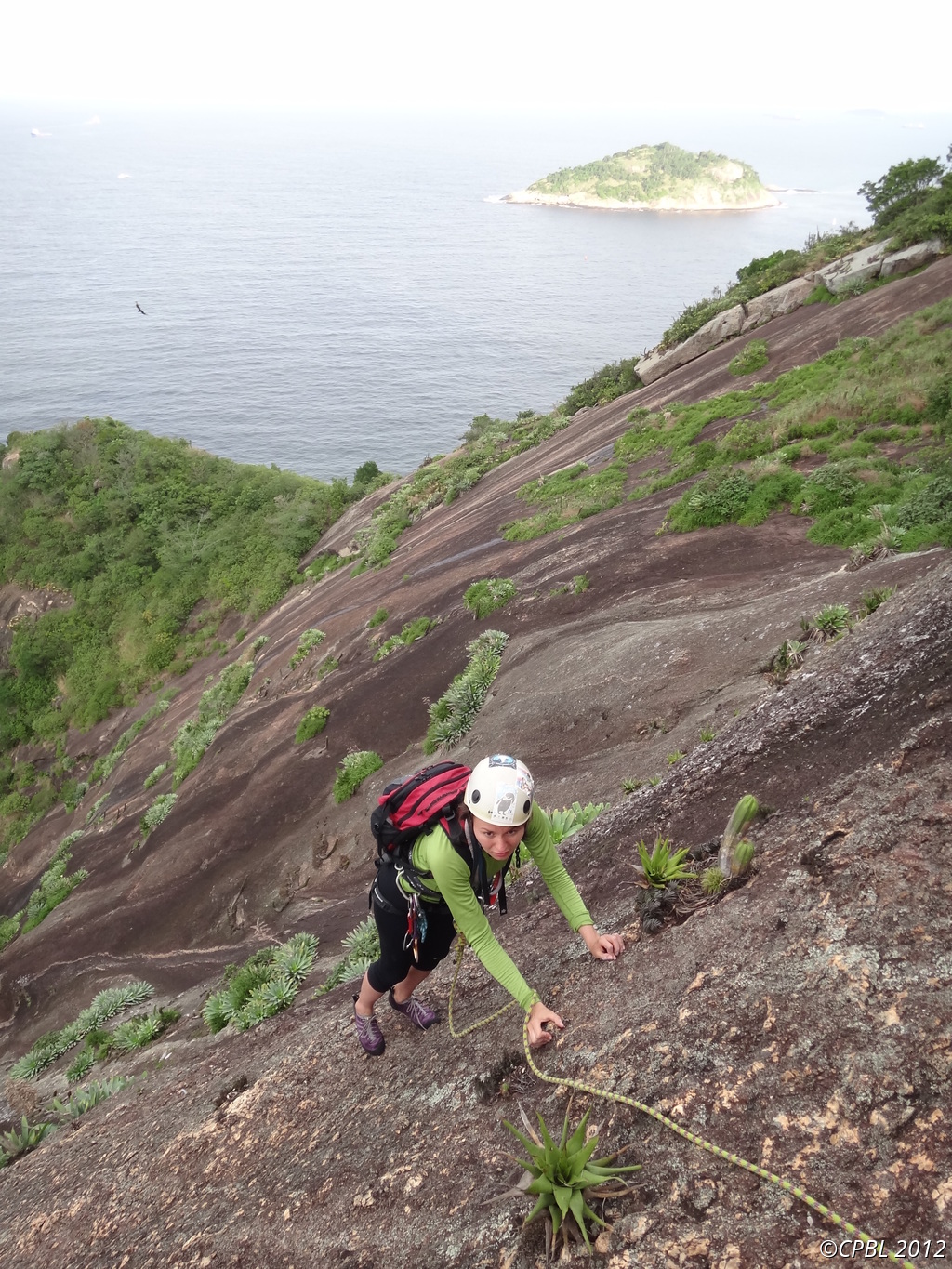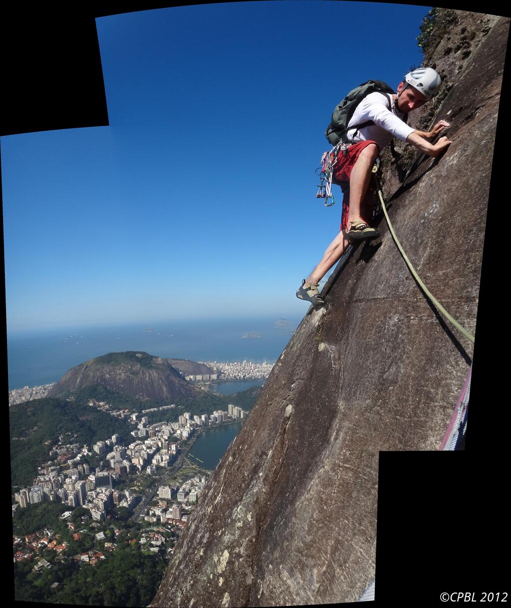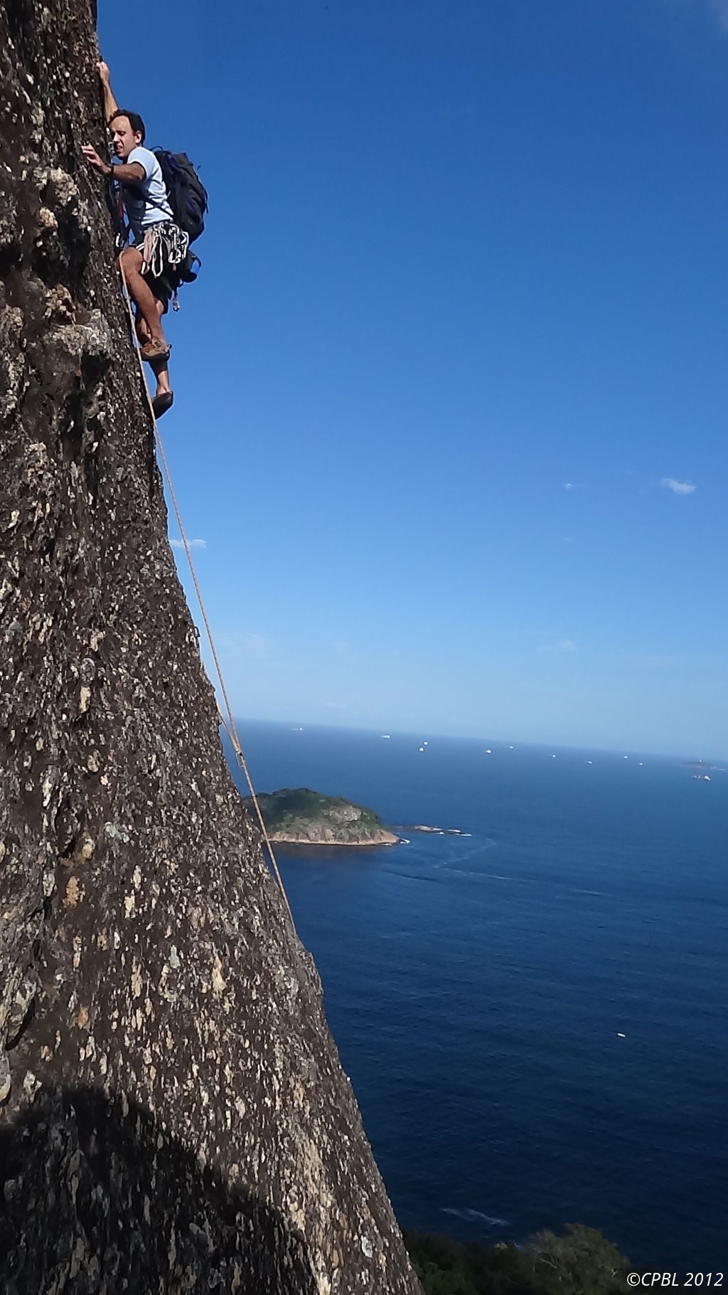 | | and I linked the final two. The last pitch is a face augmented with cement drips from the construction of the massive reinforcements above. In the background appears the Urca area (including the Sugarloaf), where we did the rest of our climbing. |