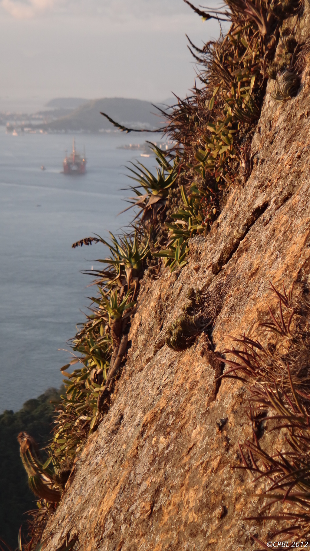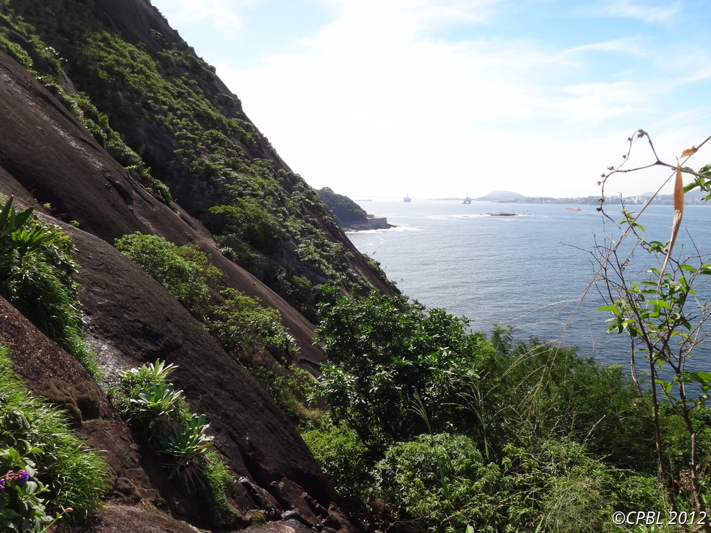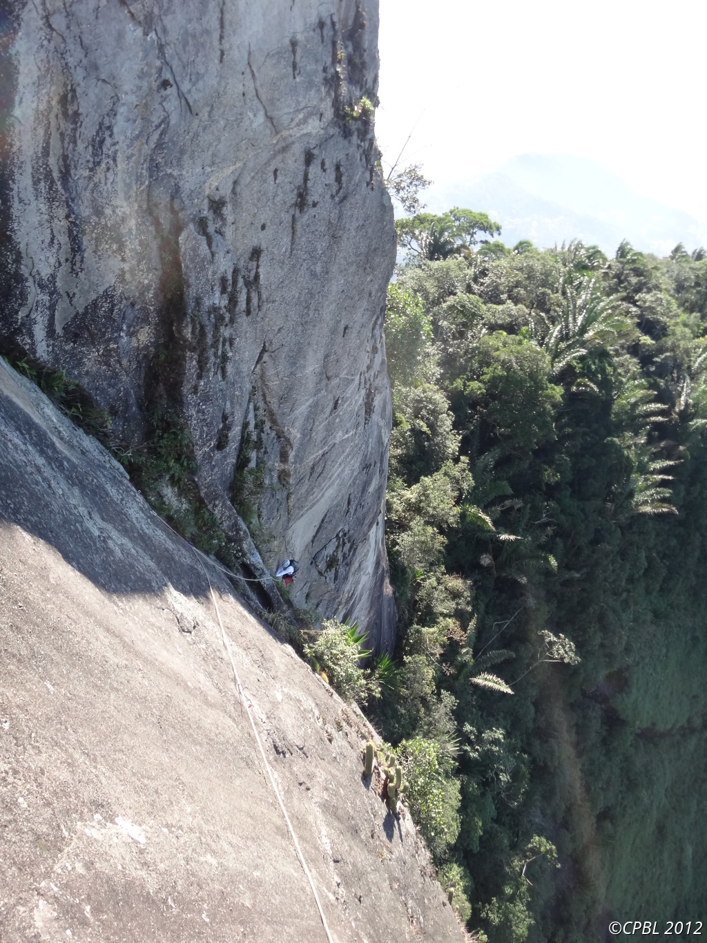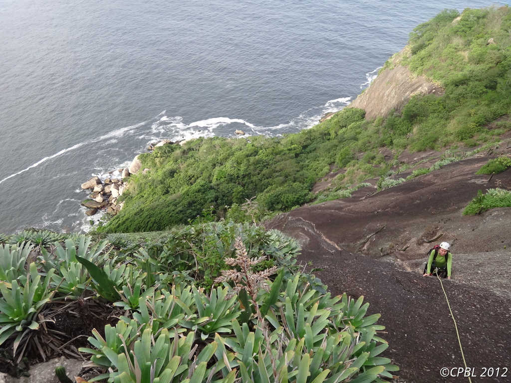| | and I linked the final two. The last pitch is a face augmented with cement drips from the construction of the massive reinforcements above. In the background appears the Urca area (including the Sugarloaf), where we did the rest of our climbing. |